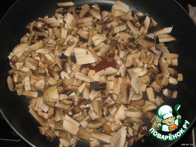 Шампиньоны нарезать кусочками. Обжарить в небольшом количестве растительного масла без запаха.