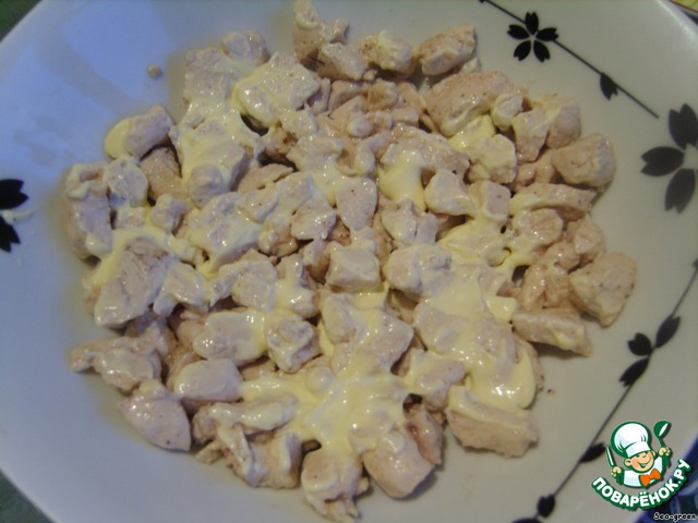 В глубокую салатницу выложить обжаренное филе и слегка смазать майонезом.