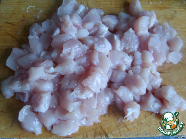 Филе курицы нарезать небольшими кусочками и обжарить.