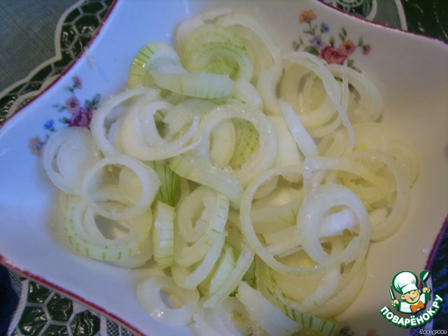 Лук нарезать кольцами и замариновать. Для этого посыпать его слегка сахаром, сбрызнуть уксусом и дать постоять минут 15-20.