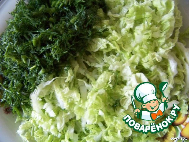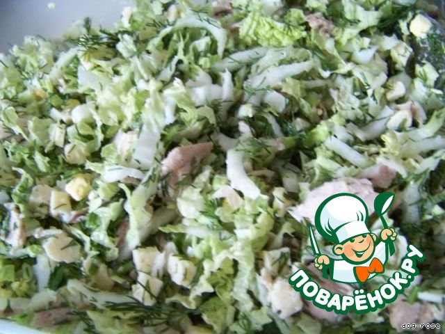 Высыпаем горошек (я не добавляла, потому что капусты положила побольше). Заправка может быть любая, я взяла свою любимую: оливковое масло + лимонный сок, немного соли и специй – по Вашему вкусу. Приятного аппетита!