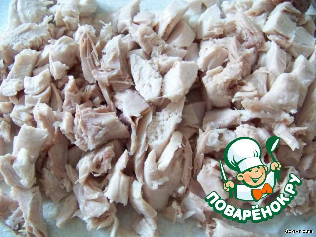 Куриное филе режем на кусочки (или можно разобрать на волокна).