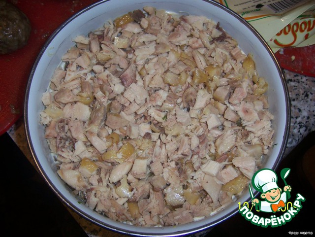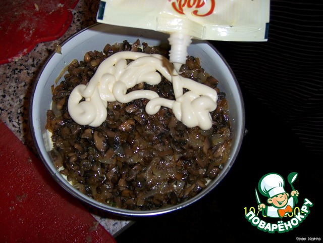 4-й слой - обжаренные шампиньоны, слой майонеза.