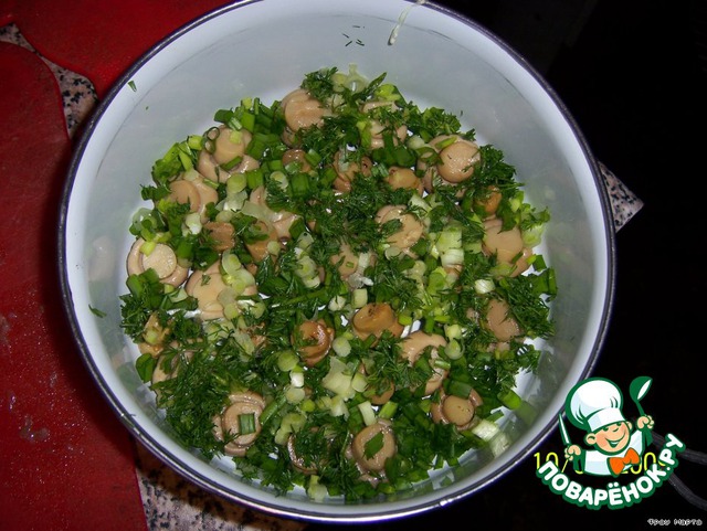Зеленый лук, укроп и петрушку мелко нашинковать.