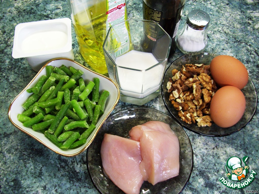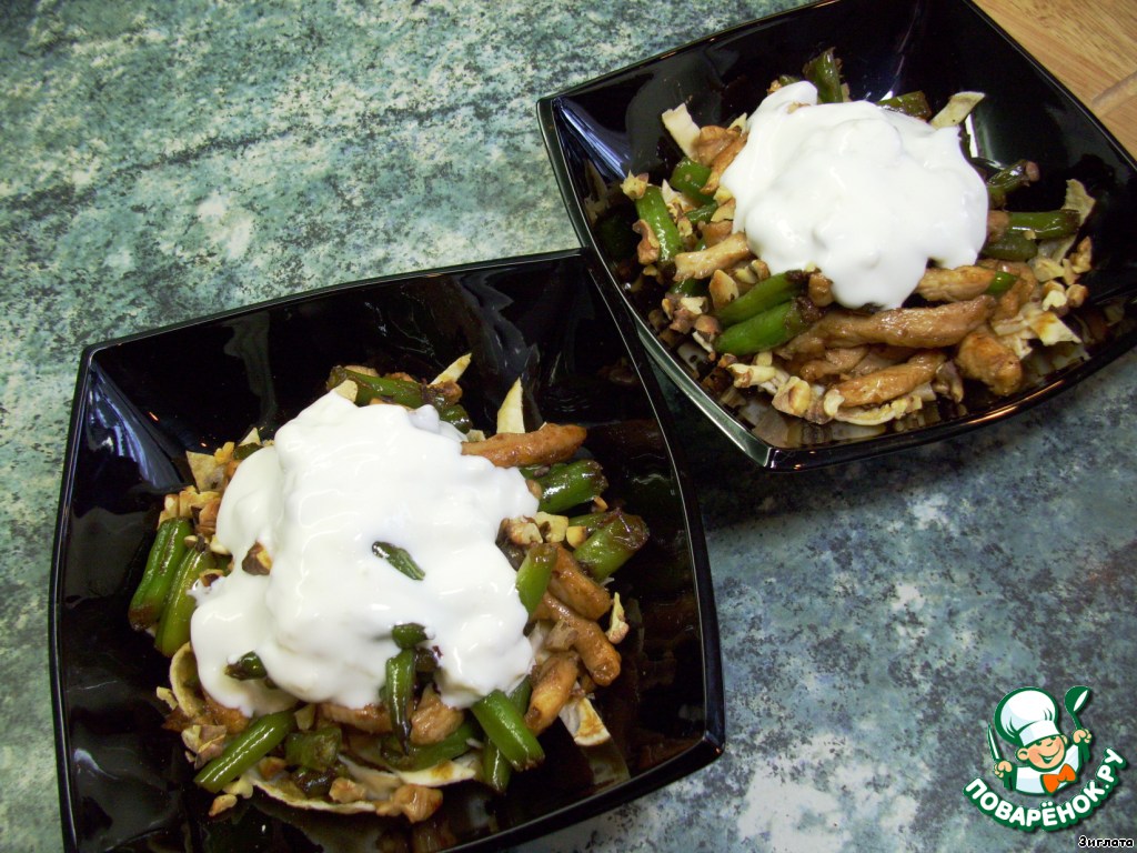 посыпать орешками и добавить заправку, у автора - это майонез, но поскольку ингредиенты обжариваются, я решила, что жира в салате уже достаточно и в качестве заправки выбрала йогурт, смешанный с раздавленным зубчиком чеснока. В общем, заправка по Вашему вкусу.