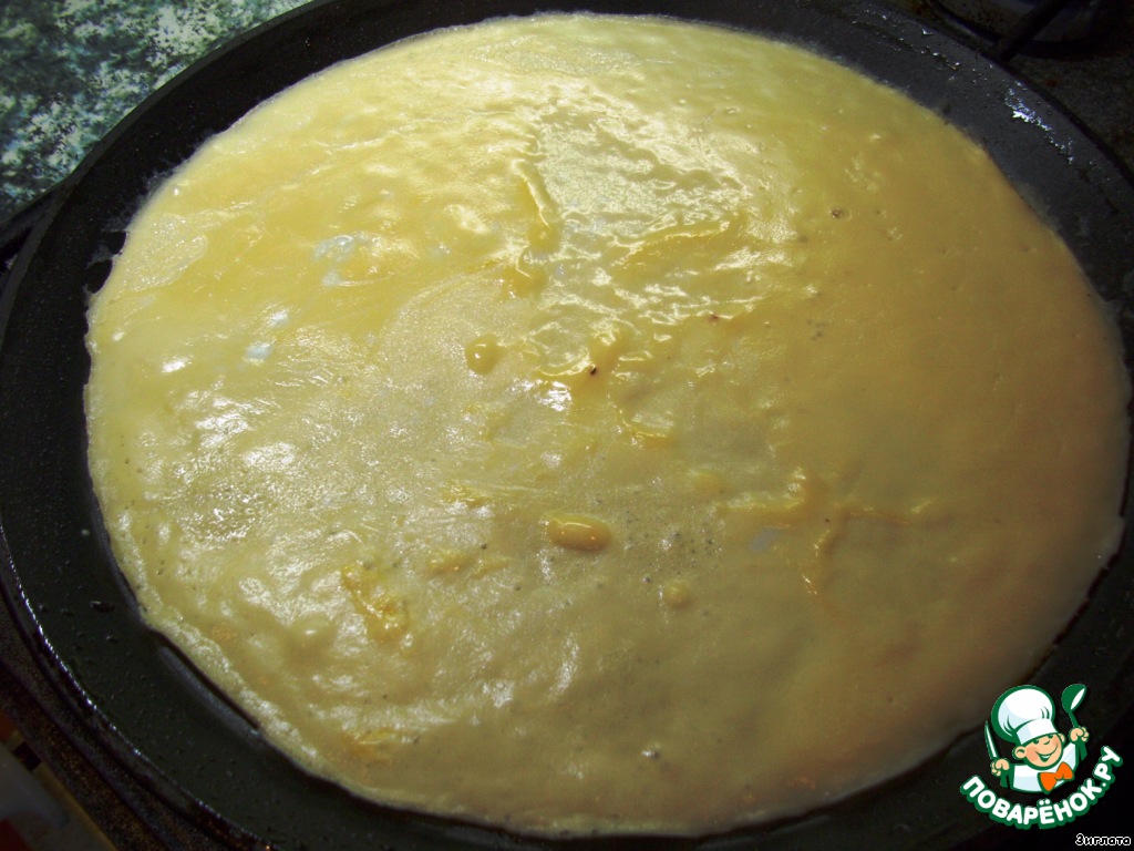 Теперь прикрыть салат остатками омлетных блинчиков и, по желанию, украсить грецкими орехами, зеленью, перепелиным яйцом.