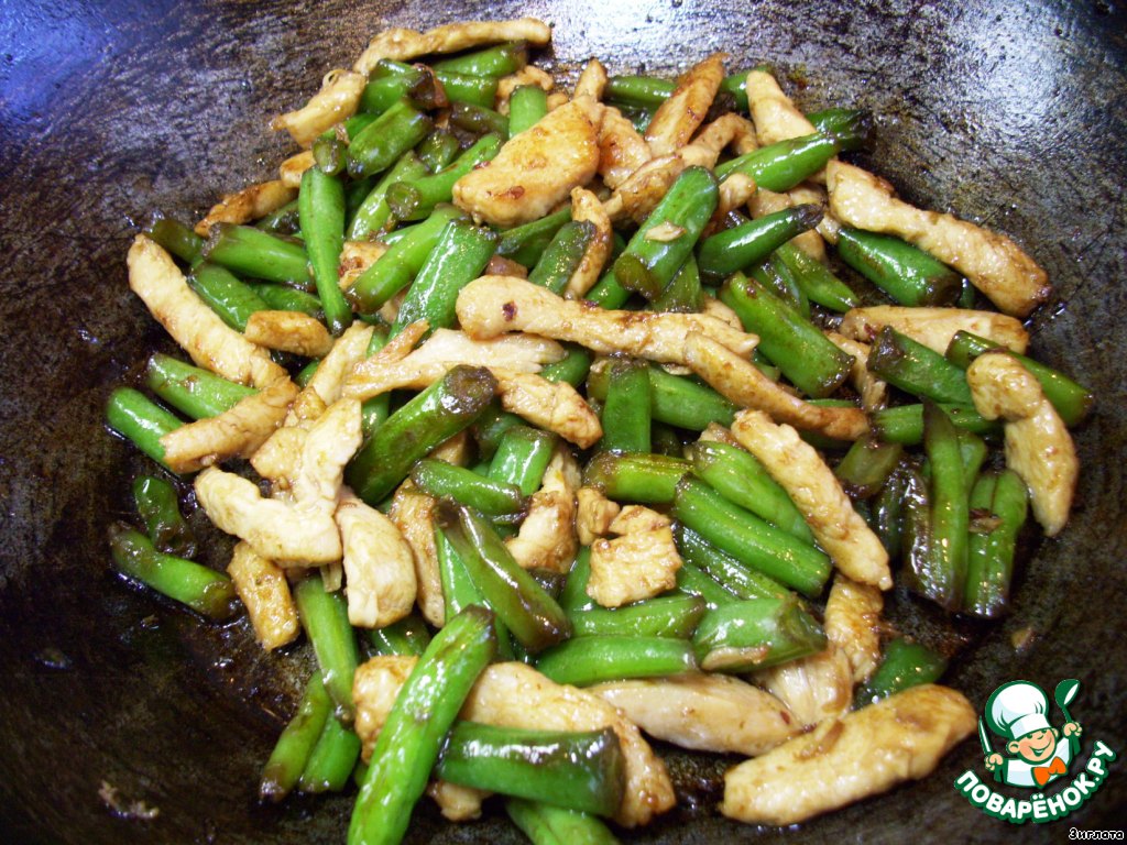 К курице добавить фасоль и готовить на среднем огне, помешивая, ещё 7-9 минут, до готовности фасоли.