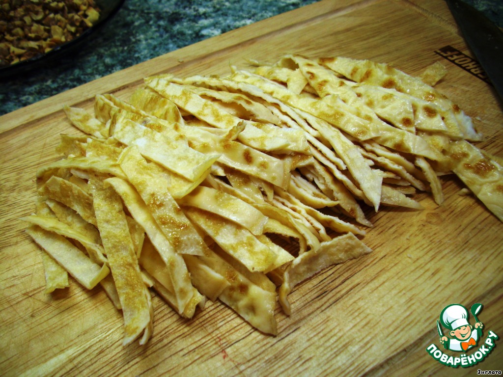 Пока готовятся омлетные блинчики, слегка обжарить и измельчить грецкие орехи.
