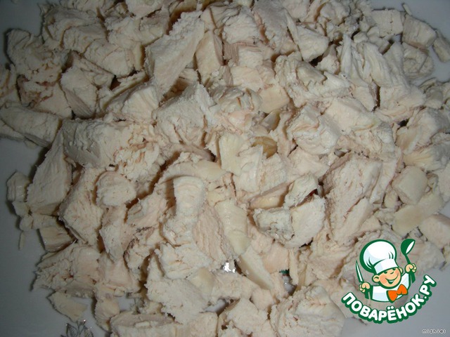 Куриное филе отварить. Нарезать кубиками.