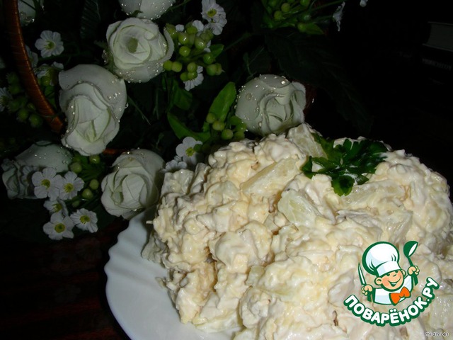 Использую этот салатик как палочку-выручалочку. Эти продукты у меня всегда есть под рукой. Если пожаловали неожиданные гости, я быстро ставлю вариться филе. А тем временем накрываю на стол, еще что-то готовлю. Нарезать ананасы и натереть сыр - минутное дело.