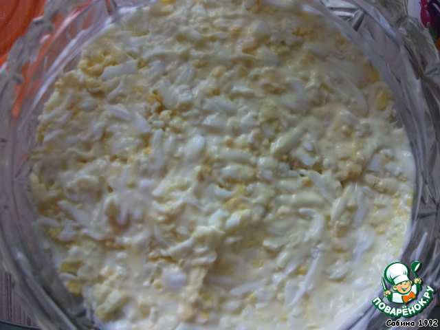 Укладываем в салатник и промазываем тонким слоем майонеза.