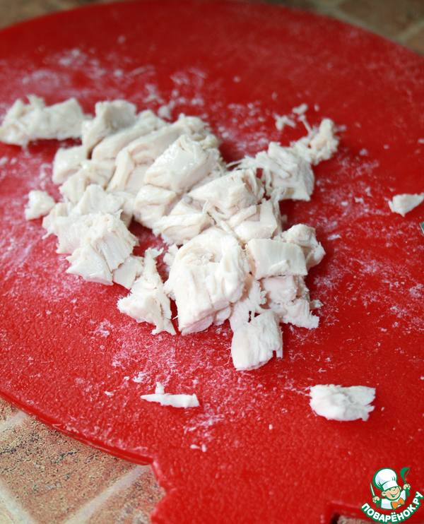 Куриное филе отварить, остудить и нарезать кубиками или полосками, как больше нравится.