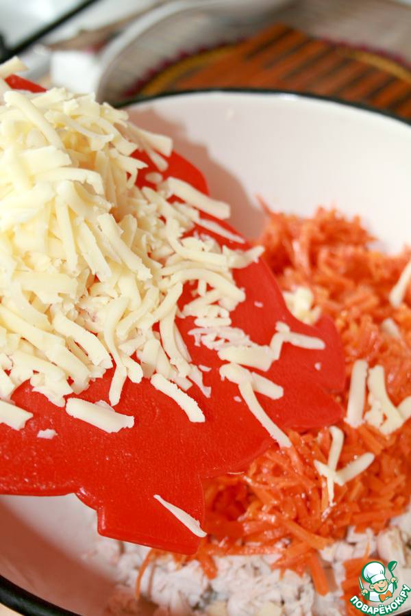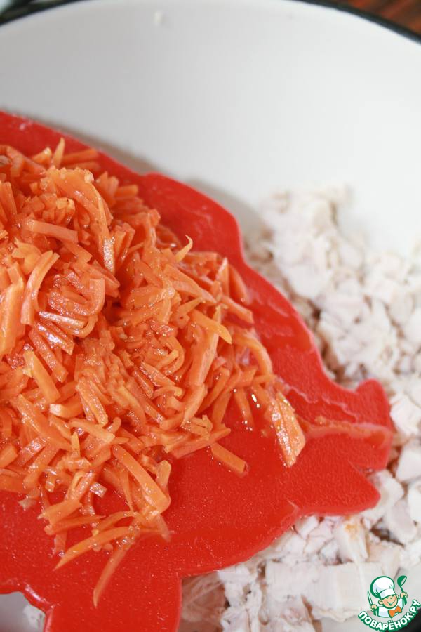 Корейскую морковь (покупной салат из морковки) нарезать мелкой соломкой.