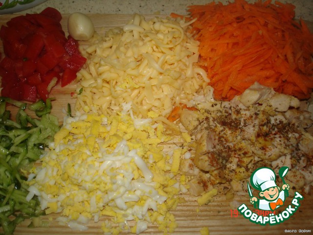 порезать кур. филе,присыпать специями и выдавить через пресс чеснок,морковь на терке,сыр на терке,помидоры порезать кубиками,яйцо на терке,капусту мелко пошинковать,огурчики на терке