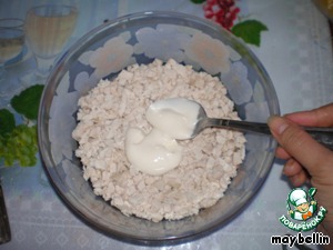 1 слой - отварное, мелко нарезанное мясо птицы. Намазать майонезом.