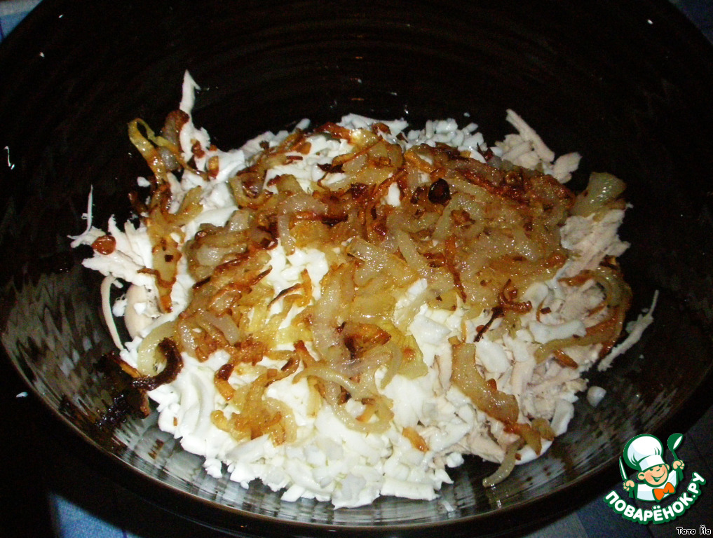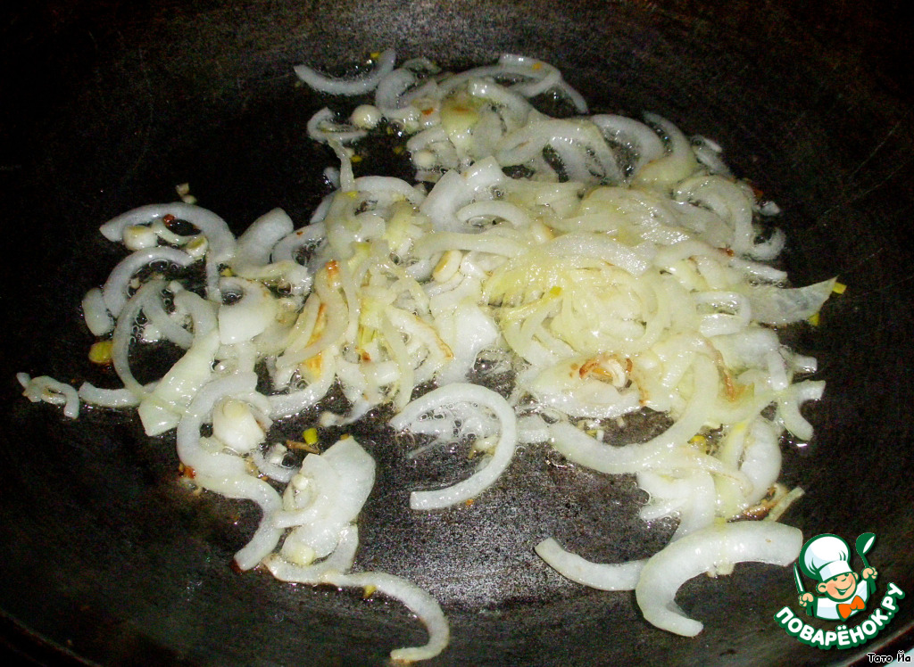 Лук нарезаем полукольцами и обжариваем слегка. Потом выкладываем на салфетку, чтобы убрать лишний жир.