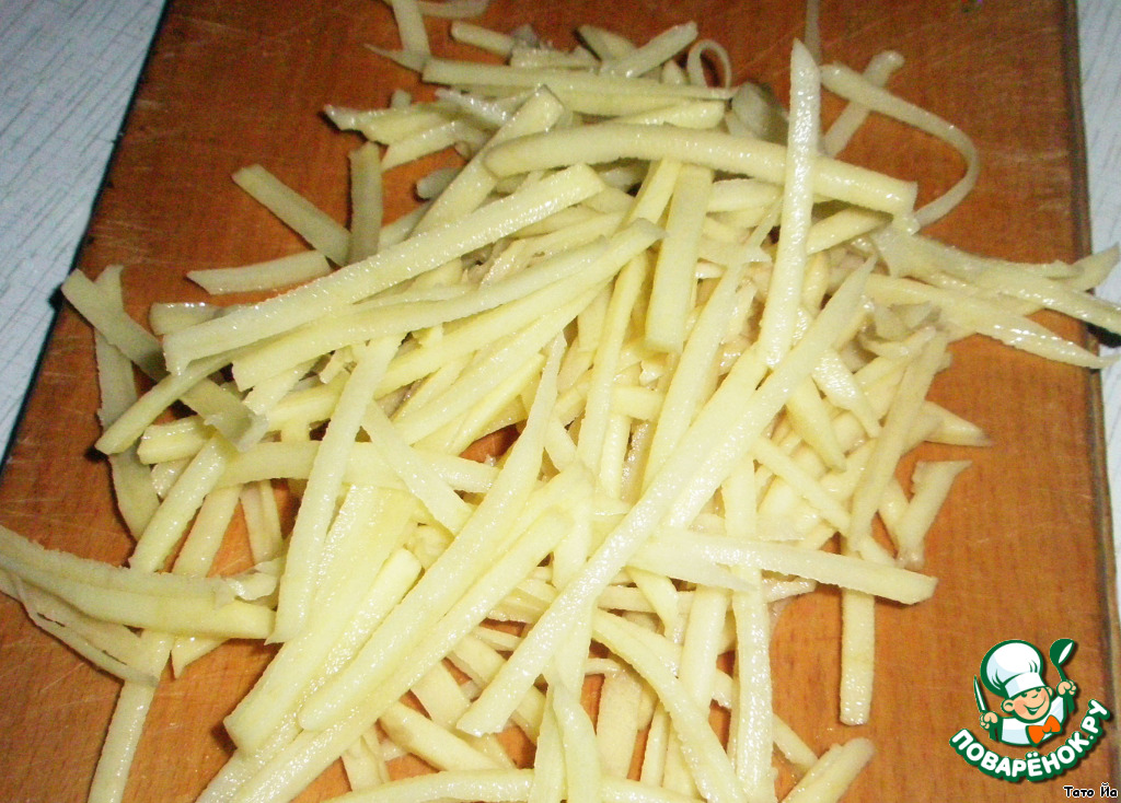 Картофель режем тонкой соломкой. Можно ипользовать терку для морковки по-корейски. Я так и сделала)