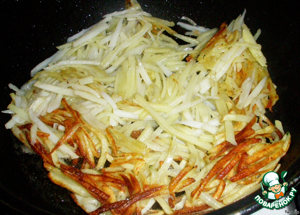 Обжариваем соломку на среднем огне в небольшом колличестве масла до золотистой корочки. Надо перемешать всего несколько раз, только лишь, чтобы вся соломка не слиплась. Потом выложить на салфетку.