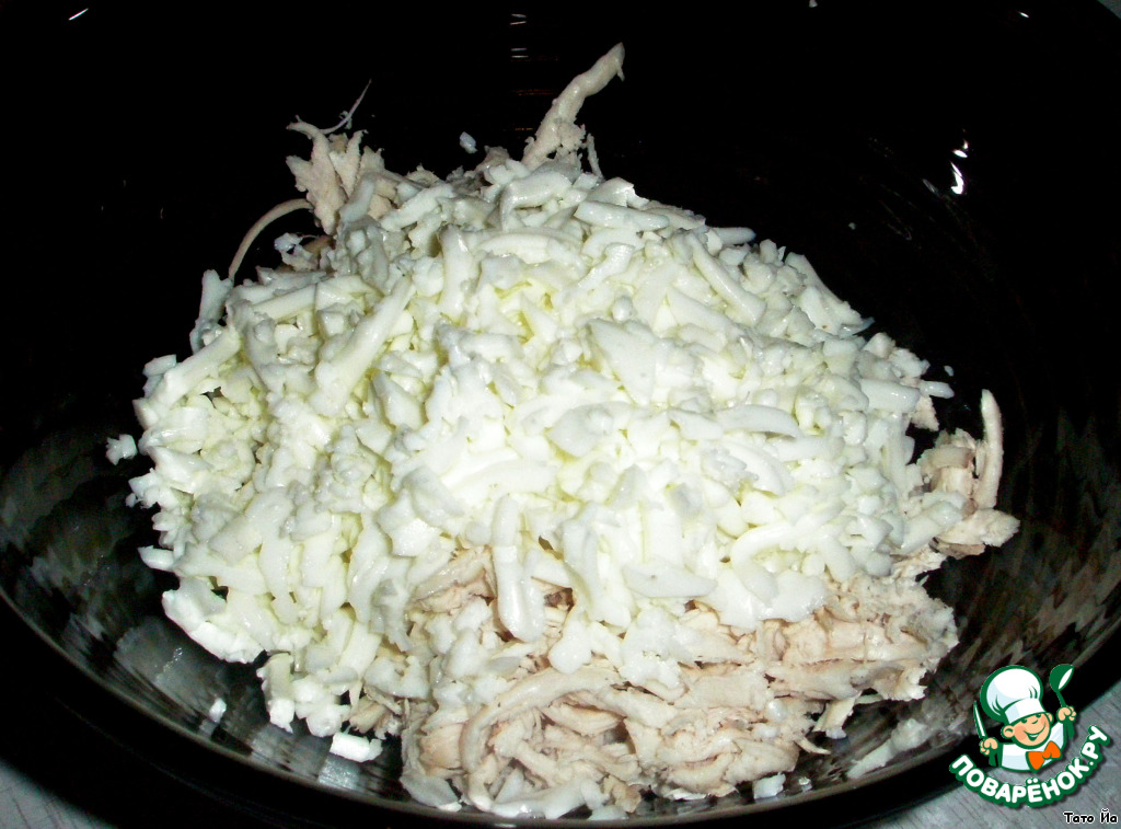 От вареных яиц отделяем белки и трем их на крупной терке. Смешиваем с курочкой.