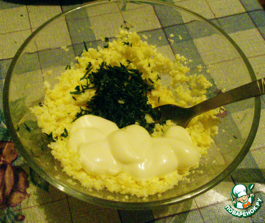 Займемся "детками". Измельчаем желтки. Добавляем майонез и мелко нарезанную зелень.