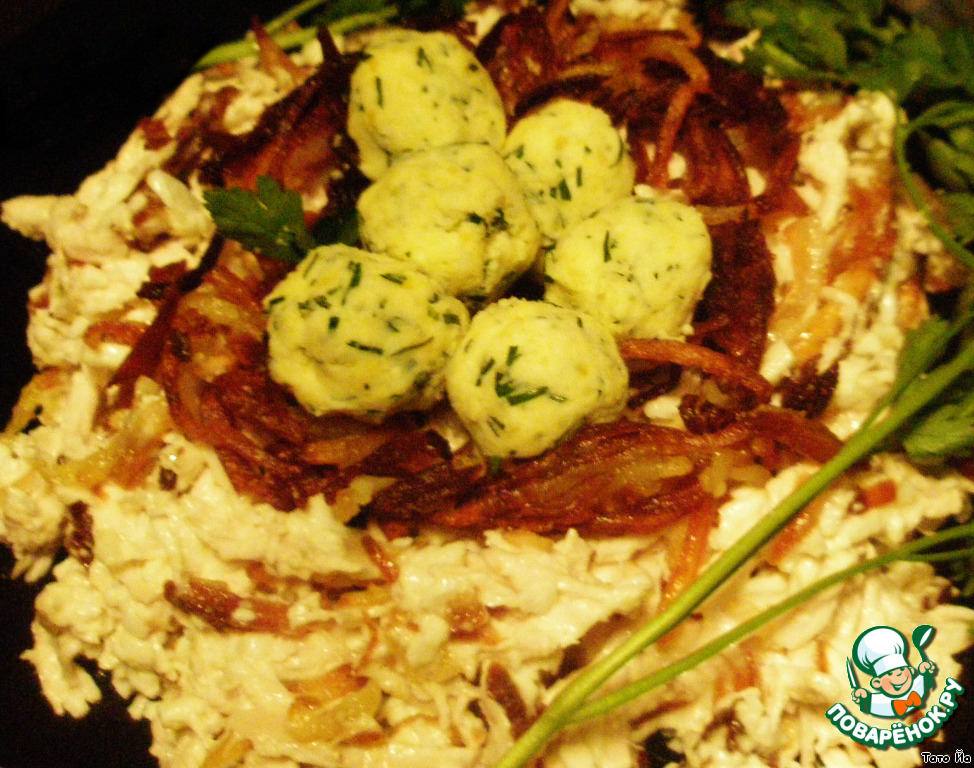 Выкладываем салат на тарелочку, в центр выкладываем "деток", украшаем по кругу картофелем или зеленью. У меня картофель с луком.