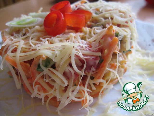 | Очень вкусный салат. Готовится просто, нарядно смотрится, съедается быстро! Рецепт из "Рецепты на бис", спасибо автору. |