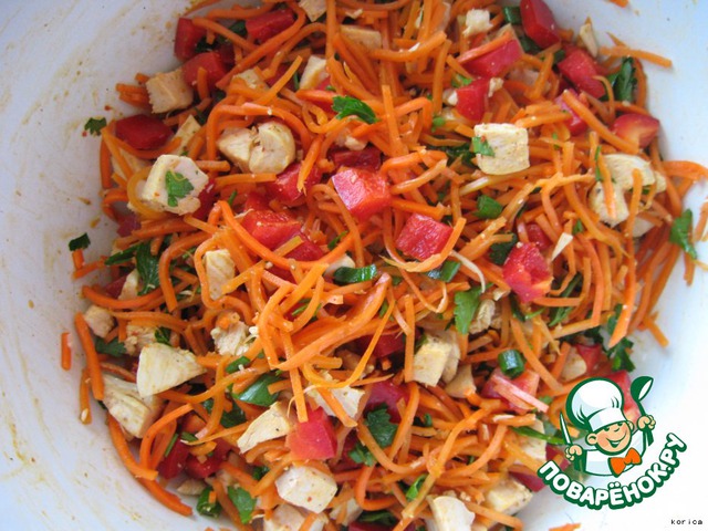 Отварную куриную грудку режем кубиками. Перчик - кубиками. Морковь немного нарезать (так легче перемешать салат, да и кушать удобнее). Из зелени кладем лучок и пару веточек петрушки. Заправляем майонезом и наслаждаемся! Сверху можно посыпать тертым сыром, но немного, так, для красоты. Приятного аппетита!