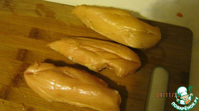 Так как грудки - один из основных ингредиентов салата, то советую выбрать их с особой тщательностью. Идеально подходят грудки натурального копчения. Не берите копченные жидким дымом. Мясо внутри должно быть светлым и нежным.