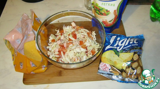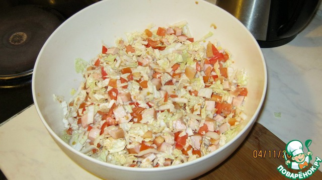 Пекинскую капусту можно слегка помять, будет сочнее.