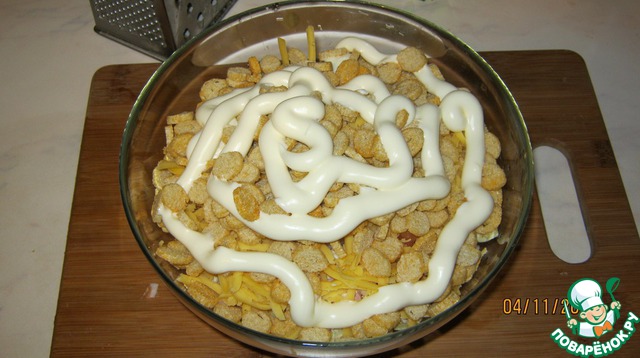 Добавляем сухарики (беру любые белые сухарики, готовые, не жесткие), трем сыр на крупной терке, добавляем майонез и перемешиваем.