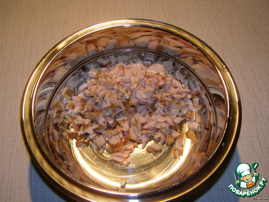 Копченую курицу нарезать небольшими кубиками. Я использовала куриную грудку, но можно и бедрышки.