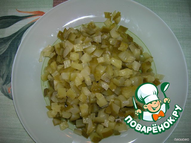 Салат вкуснее с маринованными корнишонами, но можно и просто с солеными огурцами