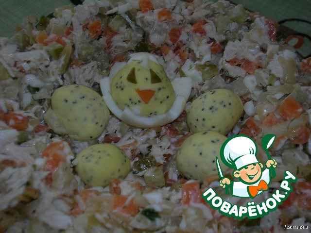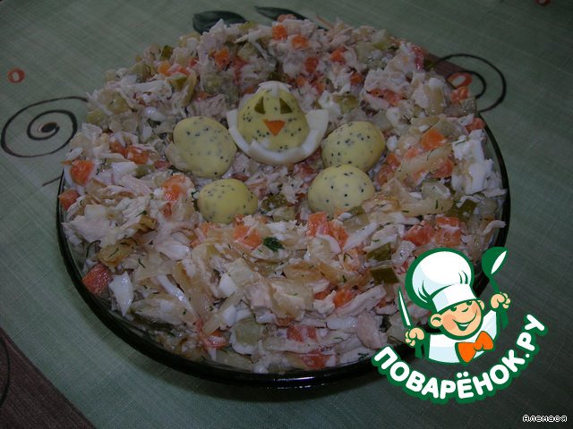 | Салат очень вкусный, хотя не требует больших затрат: ни материальных, ни физических. Вообще-то, я получила рецепт этого салата как «Гнездо», но со временем в родне прижилось название «Ленин Оливье». |