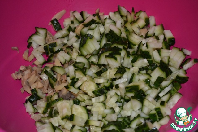 Нарезаем консервированные маринованные шампиньоны и свежие огурцы, измельчаем предварительно сваренную куриную грудку,