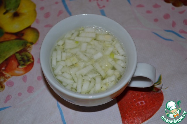 Измельчаем и ошпариваем лук. Сливаем воду и добавляем лук к уже приготовленным ингредиентам
