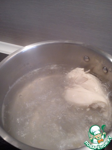 Кладем размороженное куриное филе в подсоленную кипящую воду, отвариваем до готовности (20-25 минут) Не забываем при варке филе периодически снимать пену.