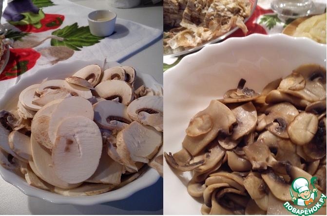 Шампиньоны нарезаем тонкими пластиками и обжариваем до готовности