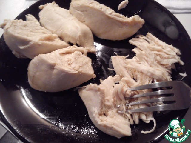 Отварное куриное филе нарезаем на полоски шириной 5-6 см, Вилкой разделяем филе на волокна.