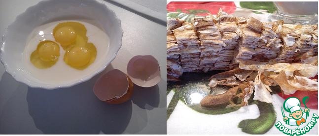 Готовим яичные блинчики: взбиваем яйца с молоком из расчета на 1 яйцо - 1 ст. л. молока), выпекаем тонкие блинчики обжаривая только с одной стороны. Блинчики нарезаем соломкой