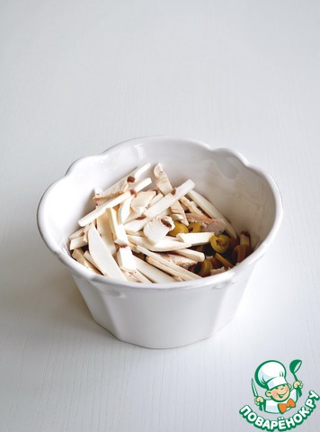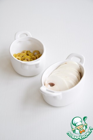 Нарезать оливки без косточек кружочками, шляпки свежих грибов очистить от кожицы. Свежие и шампиньоны в собственном соку нарезать так, как вам больше нравится.