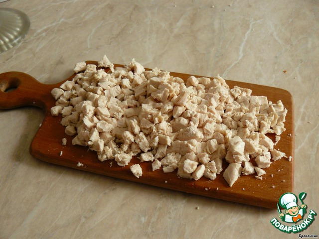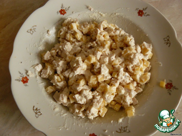 Смешиваем курицу и сыр, заправляем все это майонезом, солим, перчим