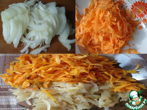 Морковь соломкой нашинковать с помощью шинковки если есть, или вручную, и тоже обжарить до средней мягкости