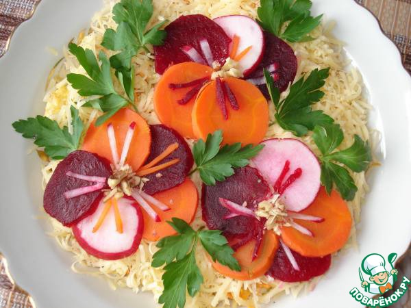 Украшаем салат выкладывая лепесточки из вареных овощей и редиса и листочков петрушки