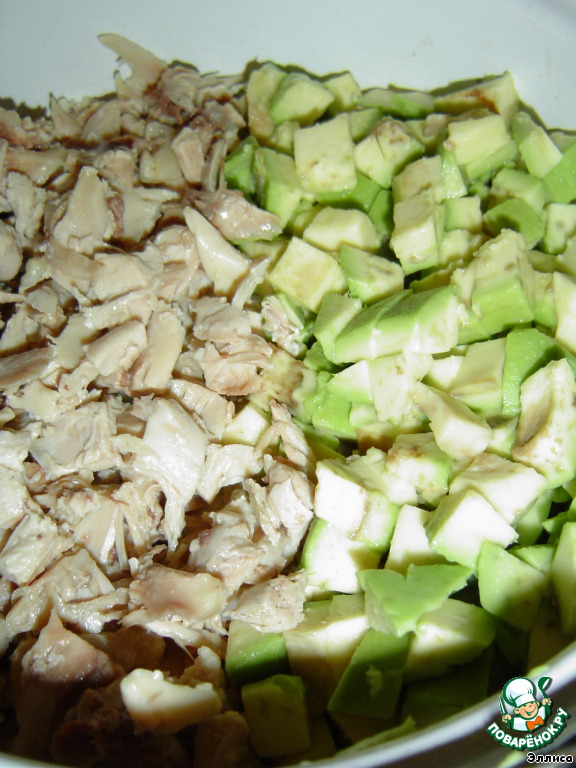 Отварную курятину нарезаем кубиками. Авокадо очищаем, удаляем косточки и, также, нарезаем кубиками.