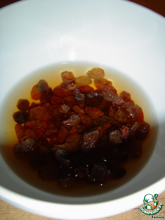 Изюм заливаем коньяком, добавляем 1 ст.л. теплой кипяченой воды, и оставляем на час.