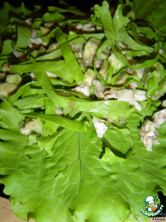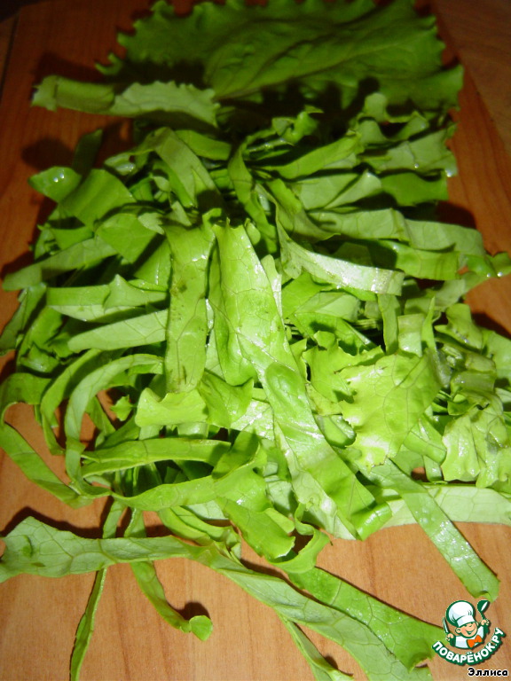 Тарелку выстилаем салатными листьями, а оставшиеся нарезаем соломкой,