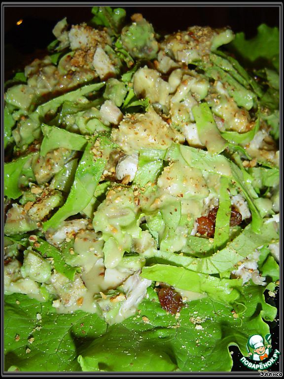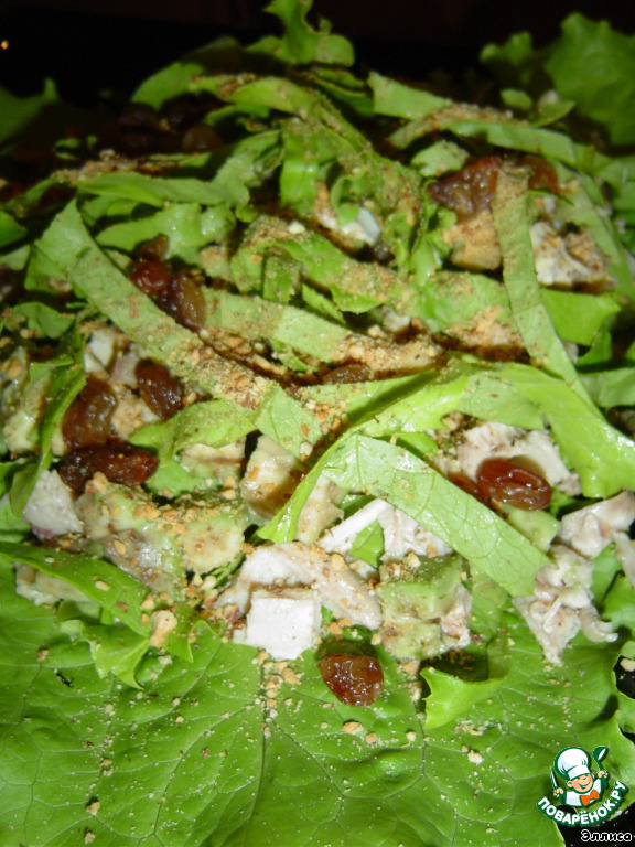 перемешиваем с кусочками курицы и авокадо, выкладываем на листья салата.