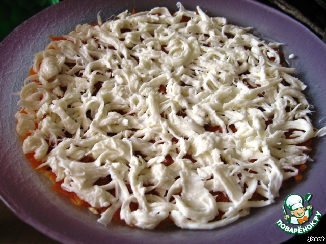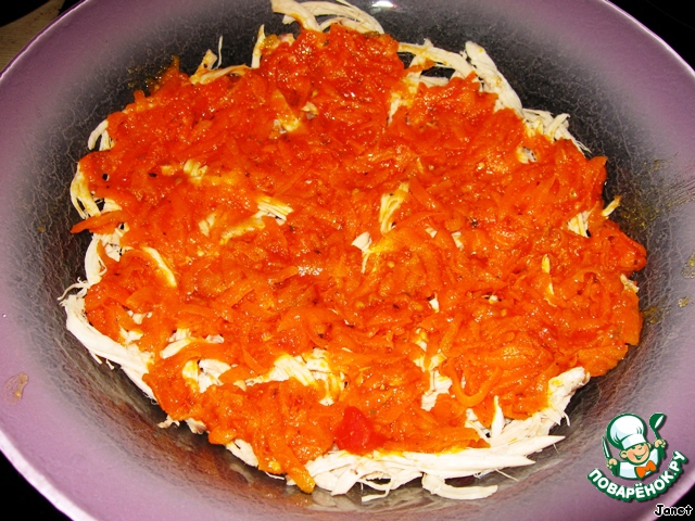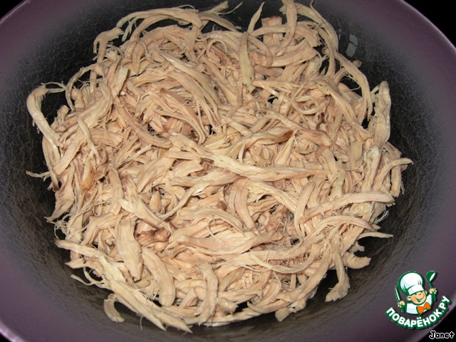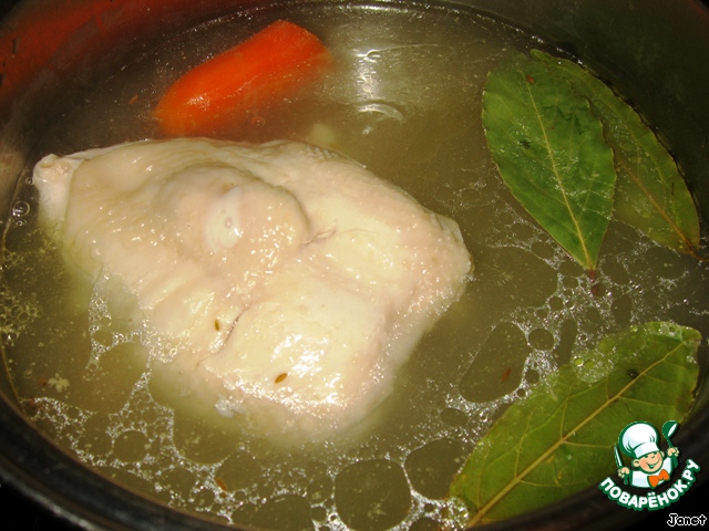 Куриную грудку поставим варить на медленном огне с 1/3 морковки. Готовое мясо выложить на блюдо. Дать остыть.