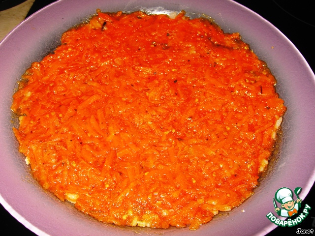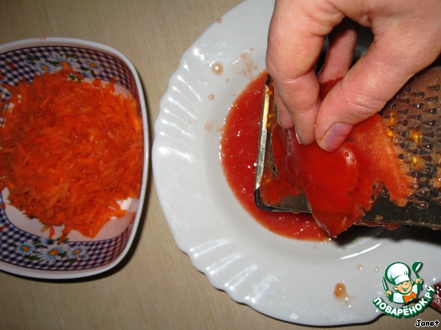 Приготовим соус для салата. Оставшуюся морковь натереть на крупной тёрке. Разрезать помидор пополам и протереть сквозь мелкую тёрку, кожура от помидора остаётся в руках!