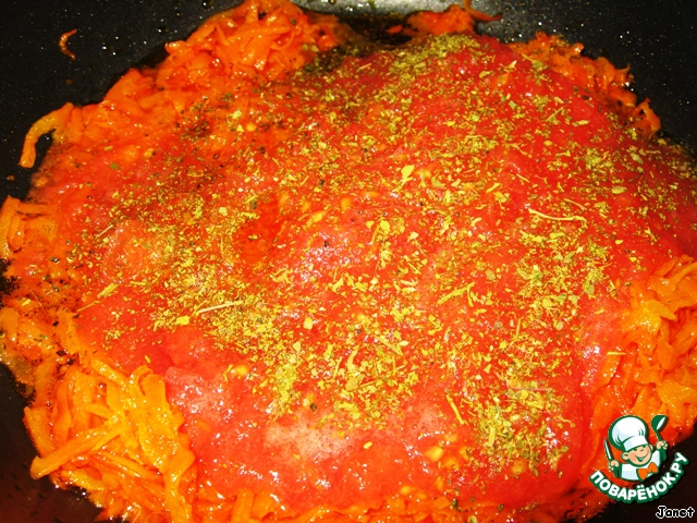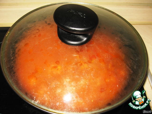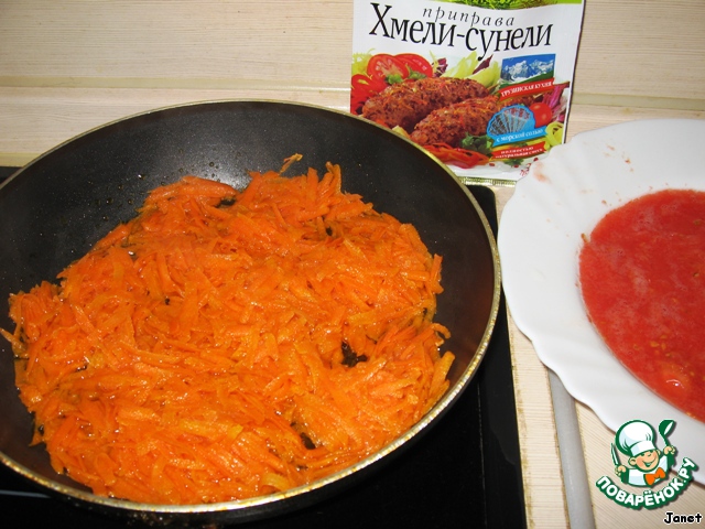 Добавить свежевыжатый томатный сок, хмели-сунели и морскую соль по вкусу.